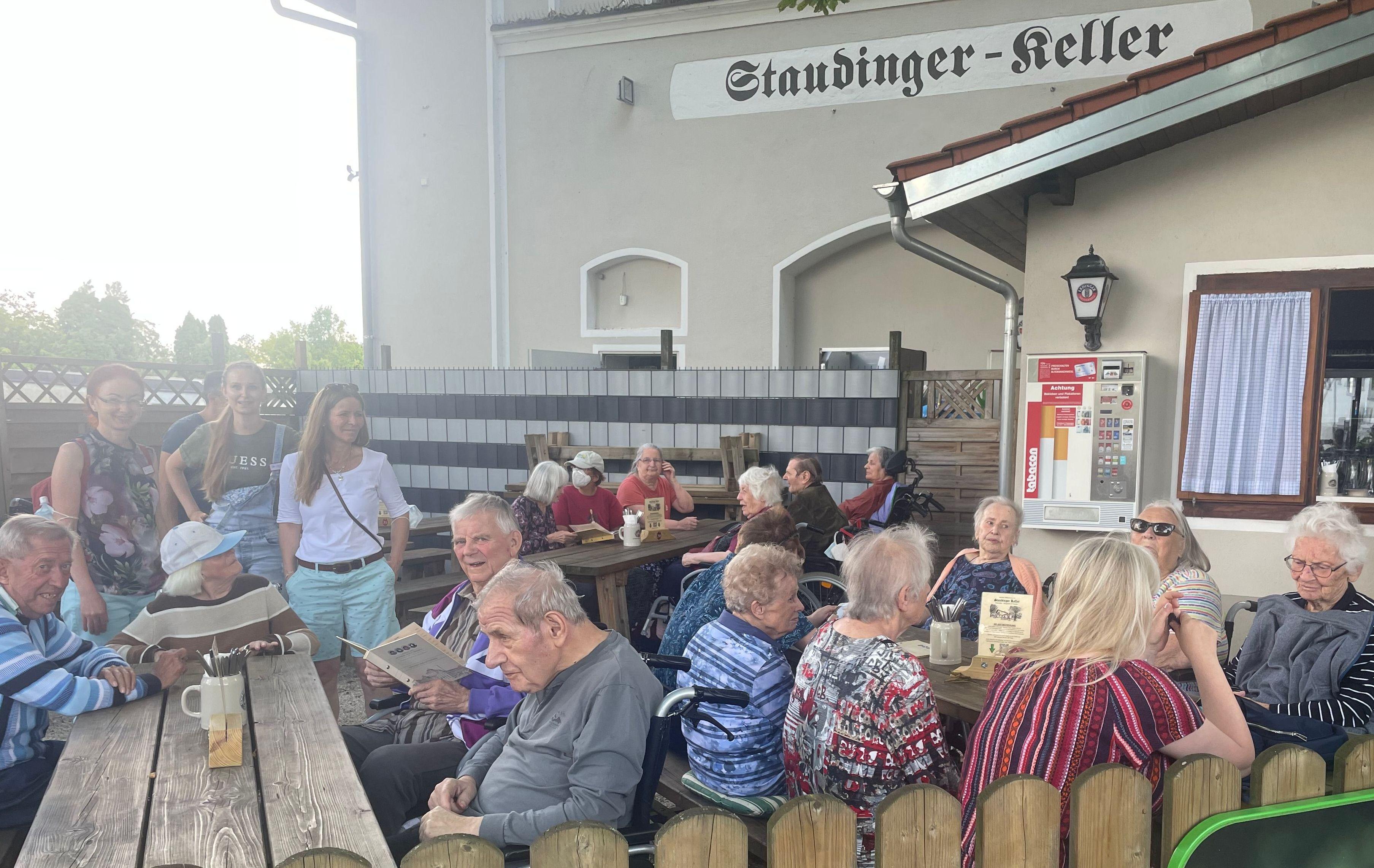 Am warmen Nachmittag bei strahlendem Sonnenschein begaben sich am 7. Juli dieses Jahres Bewohner*innen des AWO-Seniorenwohnparks Moosburg in Begleitung des Pflege- und Sozialdienstpersonals auf den Weg zum nahegelegenen Biergarten „Staudinger Keller“.